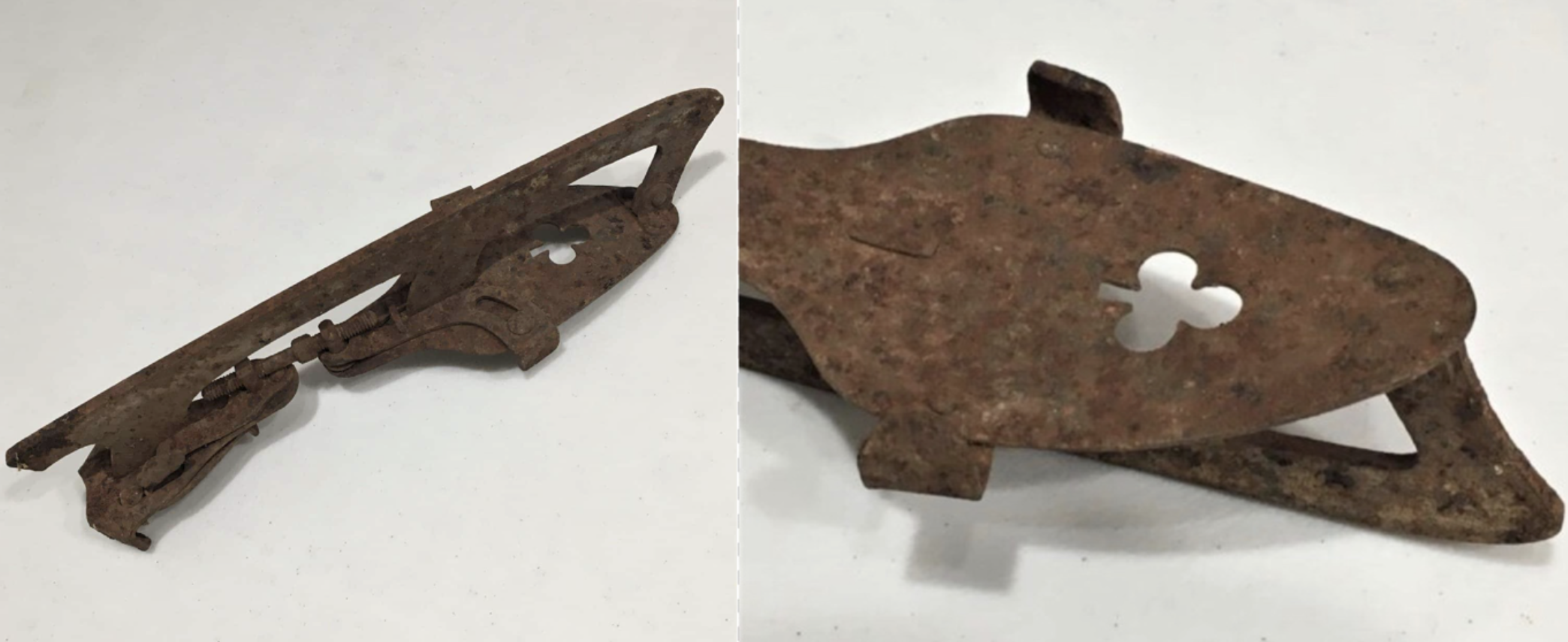 This single clip-on ice skate was found in a box of shoemaking tools purchased at the estate sale for Sarah Amanda Phlegar. The distinctive clover leaf design dates after 1894, manufactured by the Union Hardware Company of Torrington, Connecticut, and would have had a leather ankle strap. In the early 1800s, Sarah's great-grandfather George Phlegar (1762-1839) dammed up Oldfield Creek to supply water for his grist mill. The Phlegar mill pond near town became a winter recreation spot and most likely was where this skate’s original owner practiced figure-eights.