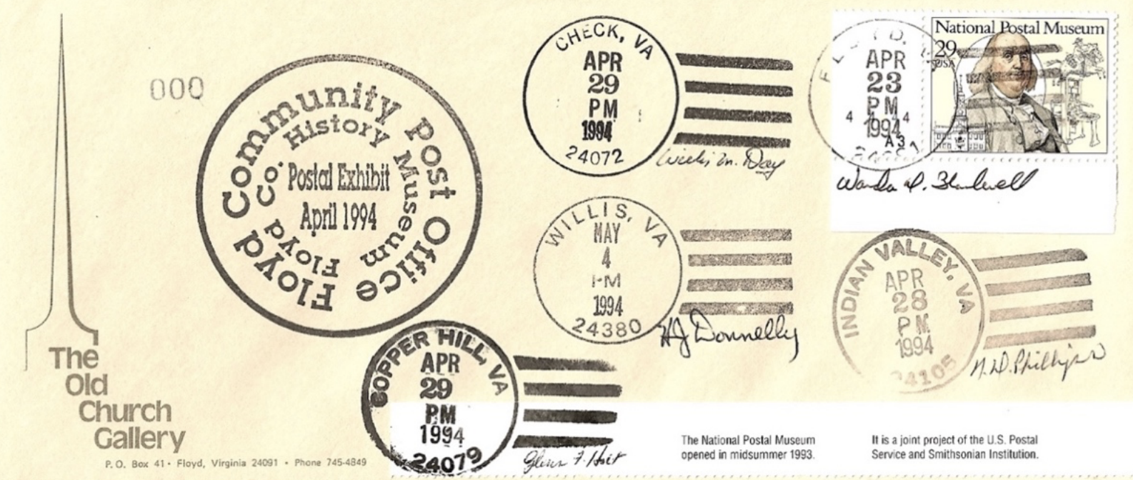 In 1994, the Floyd County Historical Society and the Old Church Gallery, with Dick Giessler as guest curator, jointly presented an exhibit on postal history in Floyd County. The exhibit, "Simpsons, Turtle Rock, Vocal, and Nasturtium," not only detailed more than 100 names and postmasters of early U.S. Post Offices in the system, but chronicled the changes of mail delivery over time. This envelope, with a Ben Franklin, National Postal Museum stamp, commemorated the exhibit with the signatures of each postmaster and postmistress of the five Floyd County post offices here in 1994.