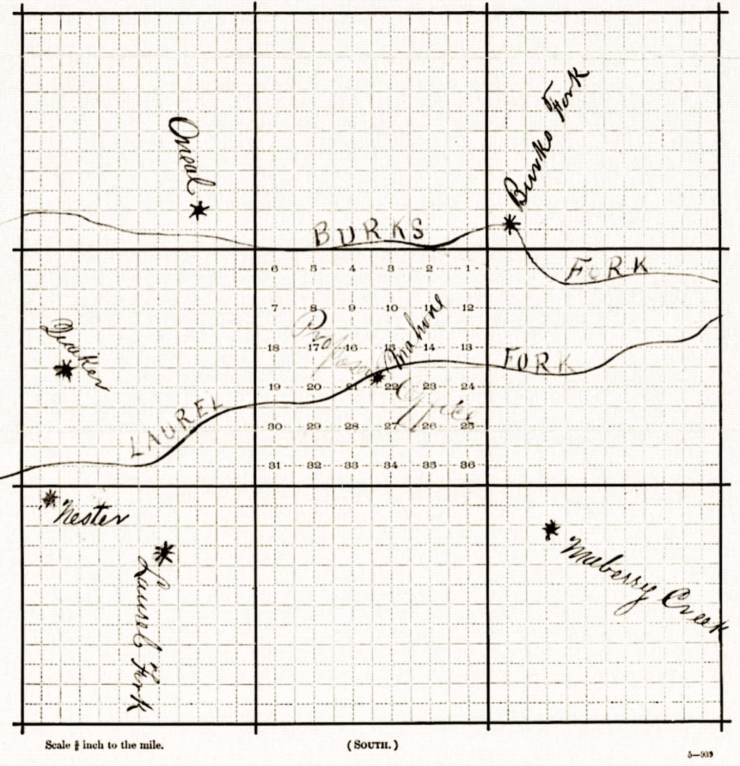 During the 19th century, U.S. Post Office topographers mapped every outpost for its horseback postal riders with delivery times and pay. This 1890 map, with what appears to be an eighteen-mile grid, shows seven post offices and a proposed eighth addition called Quoit in Burks Fork (postmasters could choose the name, and quoits is a game of tossing iron or rope rings over a post). Mail was ferried between post offices on a regulated schedule, where patrons could pick up or mail any letters or cards.