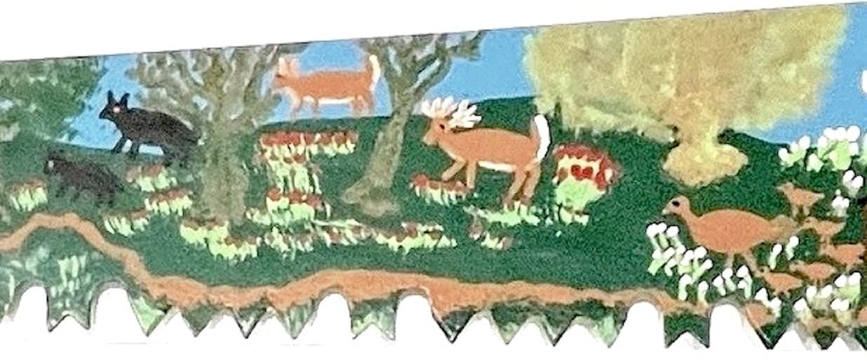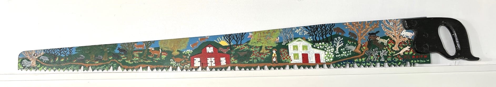 Nathaniel Selma Keith (1913-1999) painted this delightful 48-inch, one-man crosscut saw blade with scenes of farm life and collections of bear, deer, skunks, turkeys, rabbits, and other wildlife. But by the time that these storied 20th-century country landscapes came to life, the crosscut saw would have faded from popular use in the forest and on the farm.
