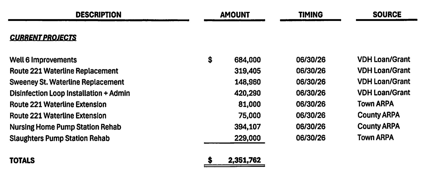 ARPA funds and grants/loans from the Virginia Department of Health played a role in these conversations being put off until now. Because of ARPA and VDH grants/loans, all of the “Current Projects” were “paid for from sources outside of the PSA,” according to the meeting packet.