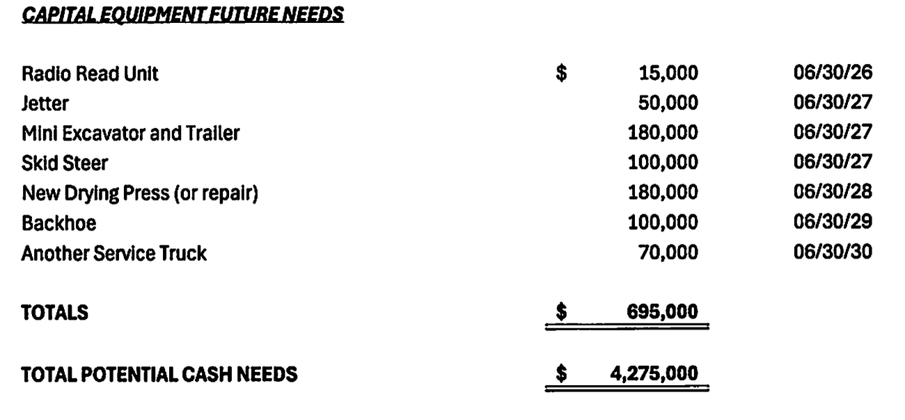 At the December 2025 joint meeting of the PSA Board, Board of Supervisors, and Town Council, the town team presented a packet of information that estimates total potential cash needs of the PSA to be $4.275 million, a conservative estimate, over the next four to five years. The packet breaks down costs into “Current Projects,” “Future Projects,” and “Capital Equipment Future Needs.”