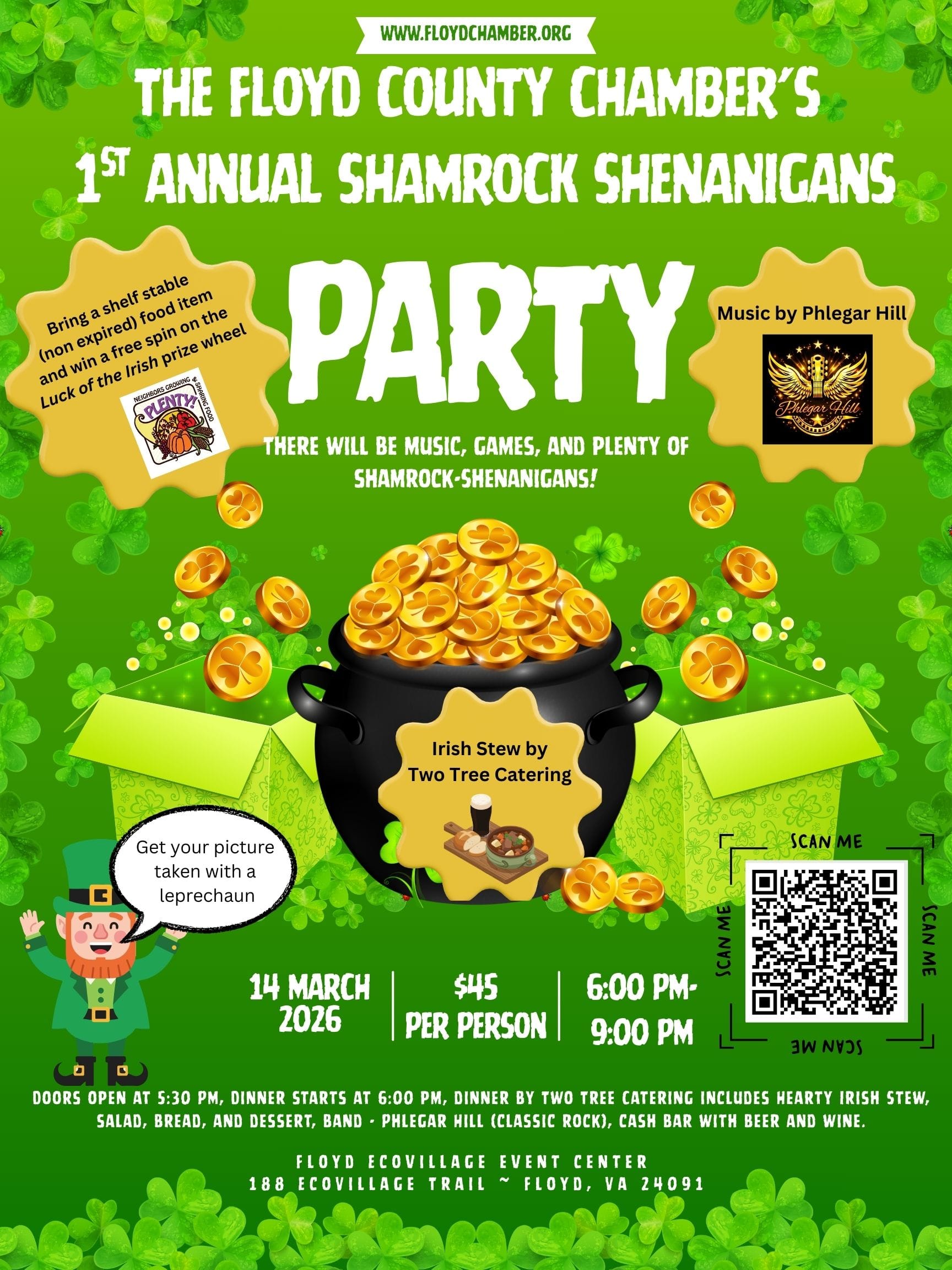 The Floyd County Chamber of Commerce invites the community to celebrate St. Patrick’s season at the first annual Shamrock Shenanigans party on Saturday, March 14, at the Floyd EcoVillage Event Center. The festive evening is open to the public, and residents and visitors are encouraged to purchase tickets now.