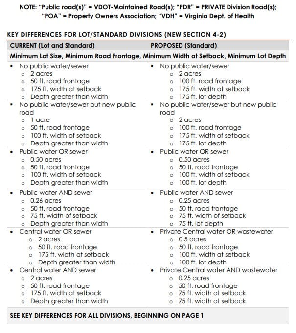 Additionally, there are conditions that must be met if lots will be divided into less than one acre, such as access to private centralized water and/or public wastewater. The Comparison of Current Subdivision Ordinance and Proposed Land Division Ordinance provided by the county includes this table: