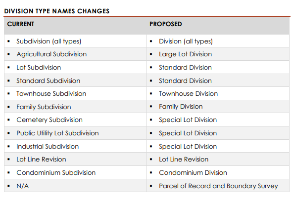 There are also a number of technical language changes from the current Subdivision Ordinance to the proposed Land Division Ordinance, such as “Agricultural Subdivision” to “Large Lot Division,” and “Lot Subdivision” and “Standard Subdivision” to “Standard Division.”