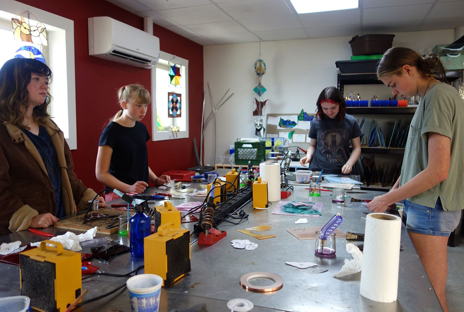Student Brook Whitlock held up her finished stained-glass piece from the mini class as others worked with focused attention. Some students may take longer, full Saturday classes if they are interested, Dickerson said. “There are some scholarship opportunities.”