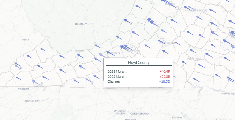 Across state races, Floyd County shifted about 10.5% to support Democratic candidates over their Republican counterparts, according to this graphic from the Virginia Public Access Project (which was made with data from the Virginia Department of Elections and the Associated Press).