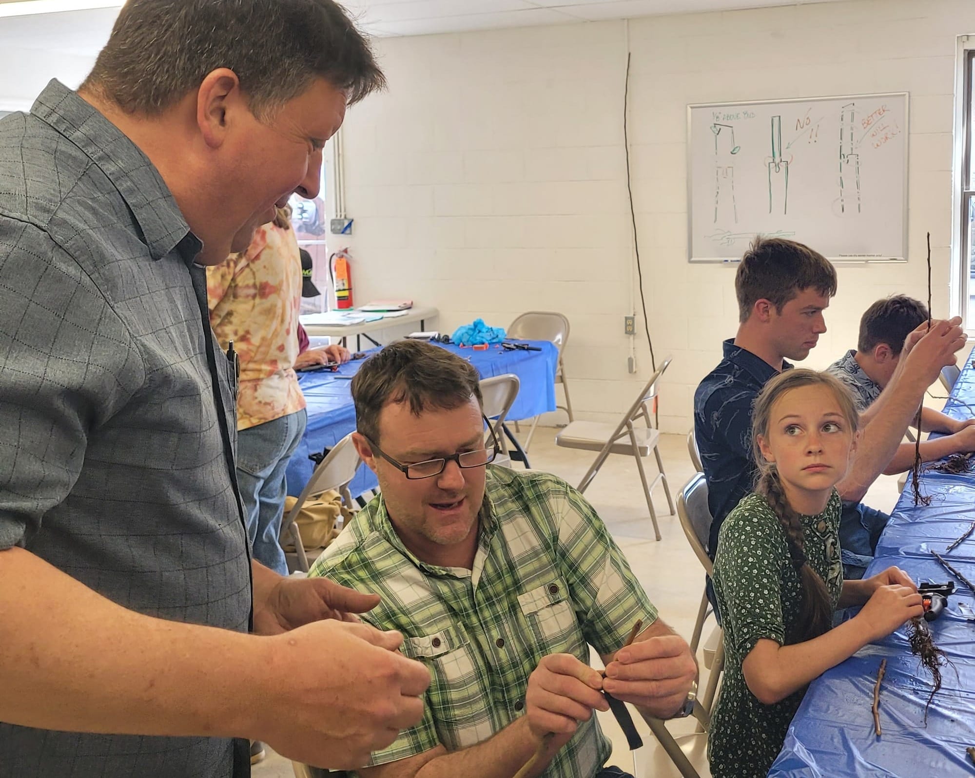 During the Extension class, each grafting participant gets a work station with grafting pliers, and electrical tape. Vest demonstrates the process, and explains the varieties of each apple scion and rootstock, then the students work with one tree at a time, matching the diameter of both scion and rootstock as closely as possible.