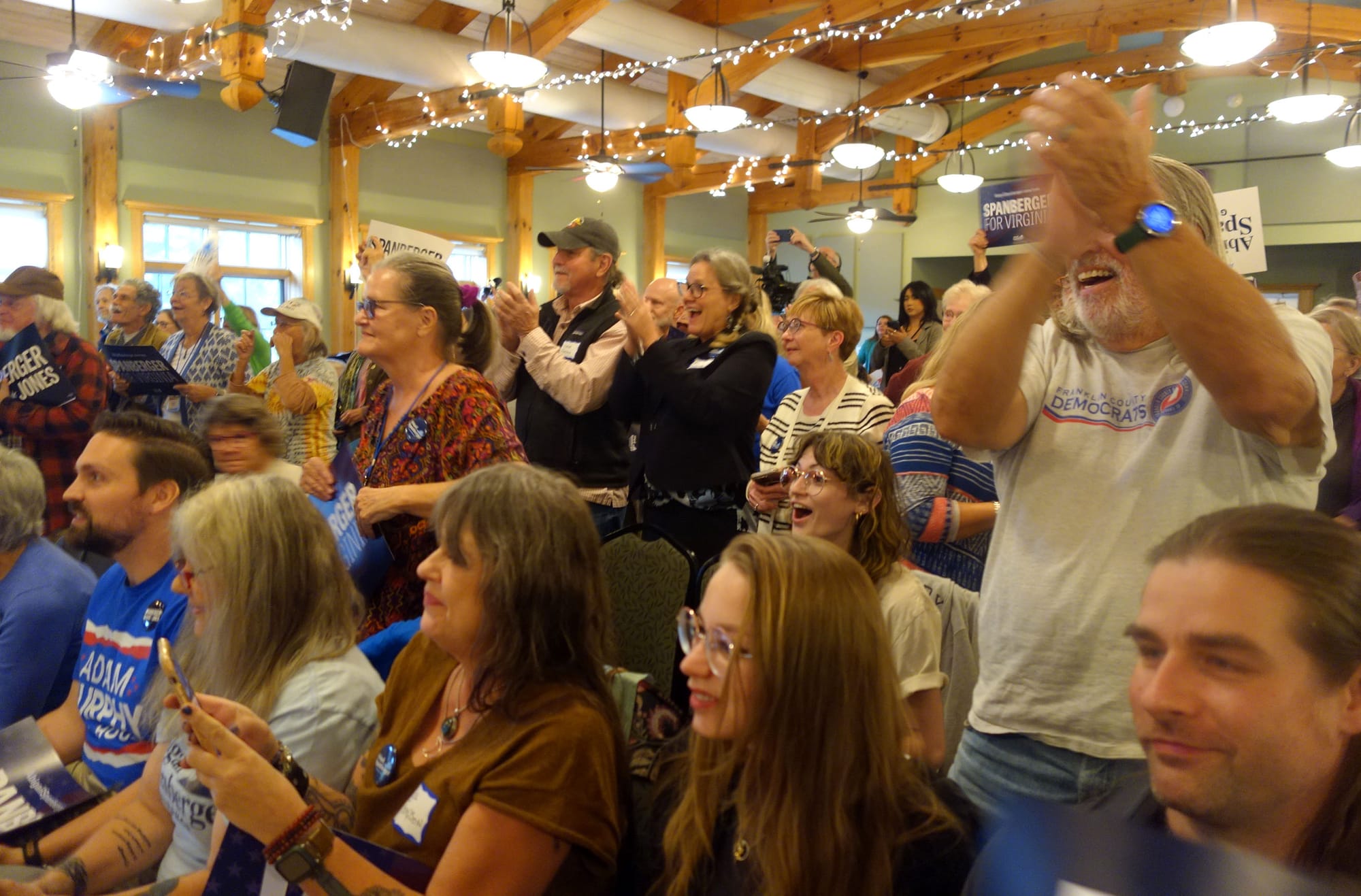 Gubernatorial candidate Abigail Spanberger took the Event Center stage at Floyd EcoVillage this week to be greeted by a crowd of nearly 200 citizens, who rose from their seats, cheered, and waved flags of support.