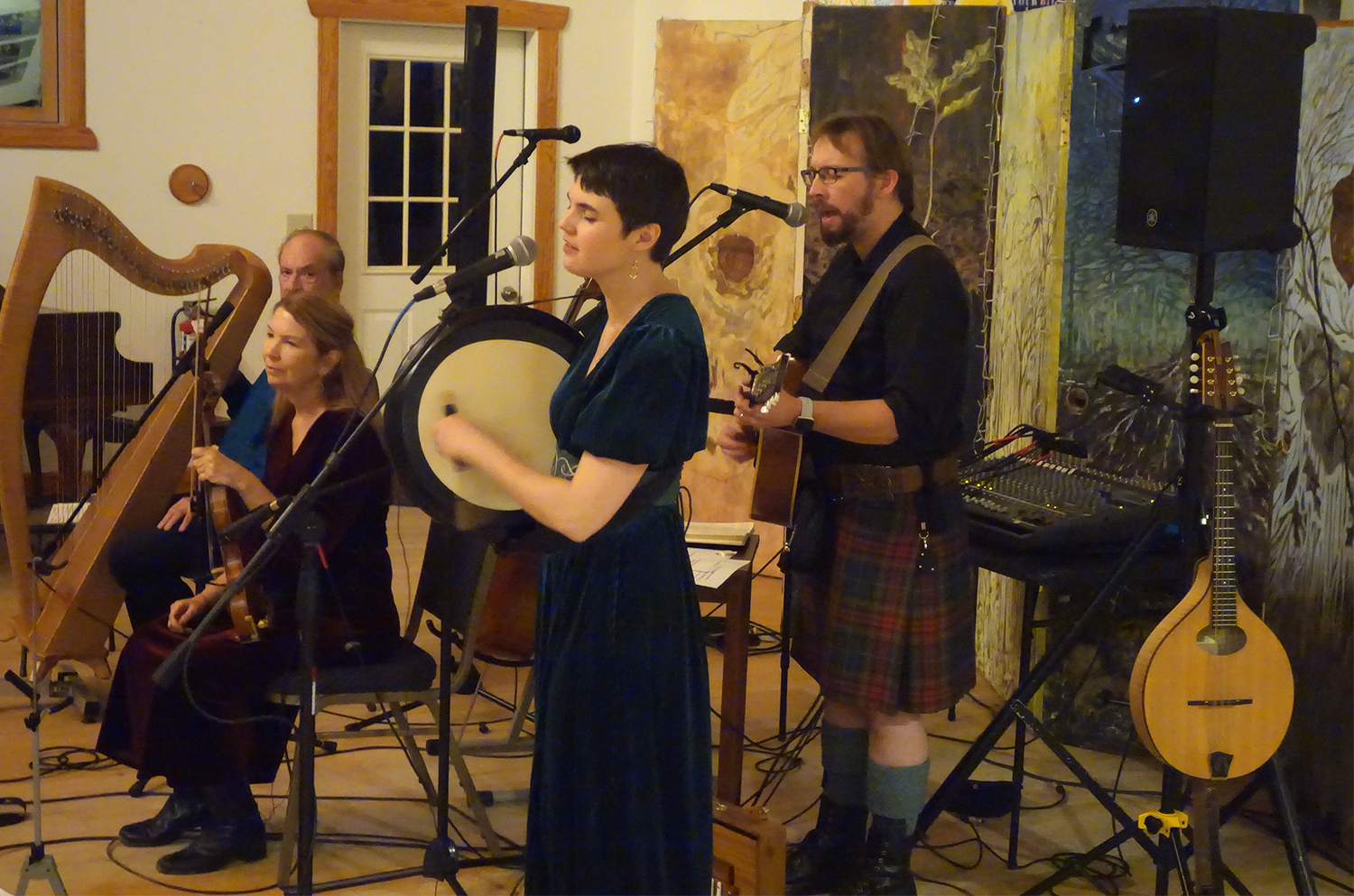 The talented concert ensemble of acclaimed musicians featured Katherine Wiley on fiddle, cello, and rebec; Julie Kinn on vocals, bodhran, and whistle; Josh Kinn on vocals, bouzouki, and octave mandolin; David Scheim on Celtic harp and piano; and Geoffrey Saur on pipes and whistle.