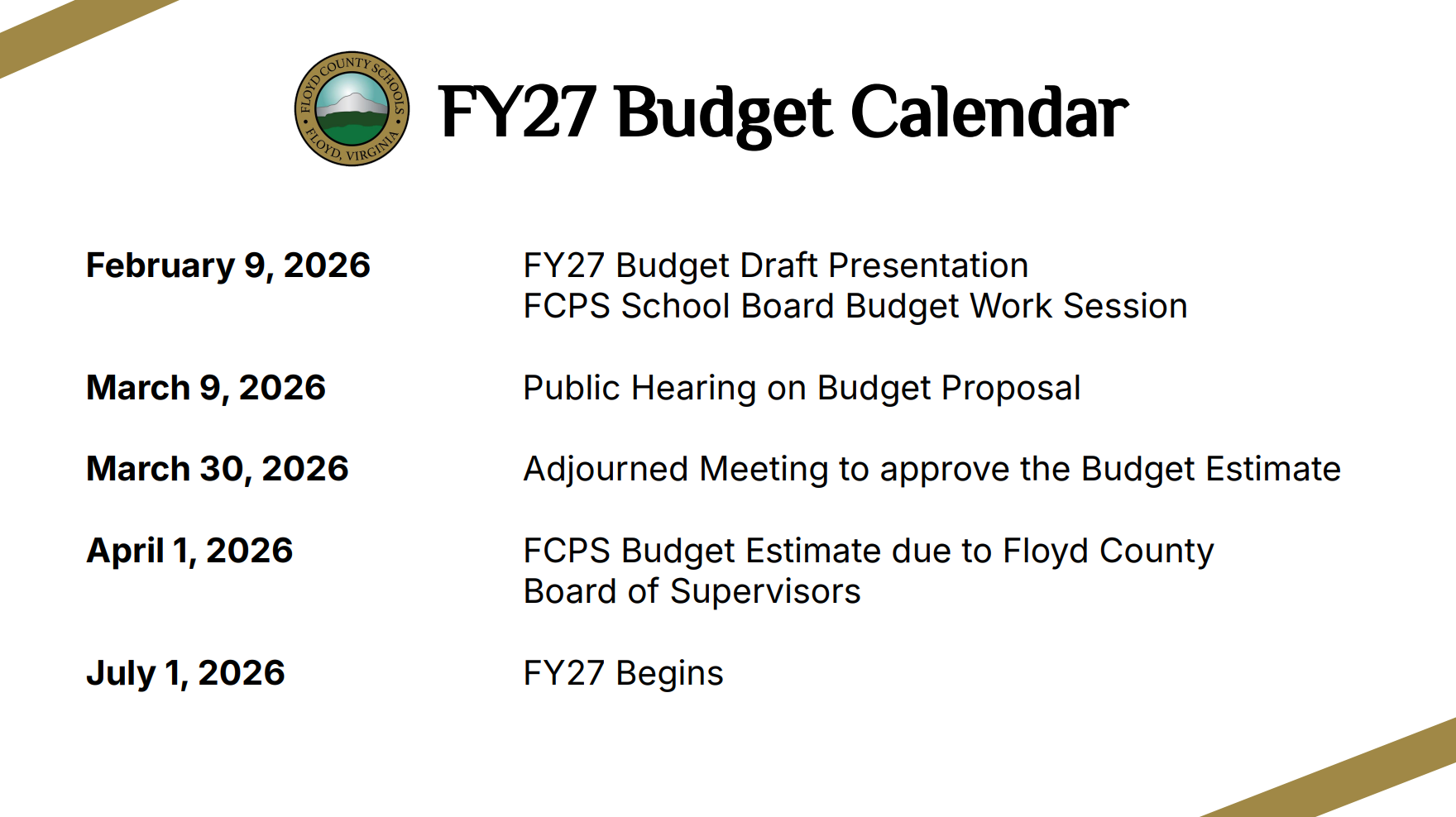 Establishing an annual budget for the operation of Floyd County Public Schools is a year-round collaborative process that involves administrators of FCPS, the School Board, state department of education, and the Floyd County Board of Supervisors. The process of approving the budget is complex, and the draft budget sees several revisions before it is finalized to take effect at the beginning of July.