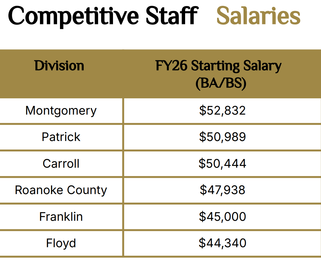 Despite ranking 49th in the state for student performance on Standards of Learning tests in 2025, Floyd County has the lowest starting salary for teachers ($44,340) for FY2026 when compared to Montgomery ($52,832), Patrick ($50,989), Carroll ($50,444), Roanoke County ($47,938), and Franklin ($45,000).